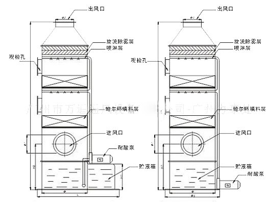 酸堿廢氣處理塔分單塔體和雙塔體。采用圓形塔體,用法蘭分段連接而成。具體由貯液箱、塔體、進(jìn)風(fēng)段、噴淋層、填料層、旋流除霧層、出風(fēng)錐帽、觀檢孔等組成。